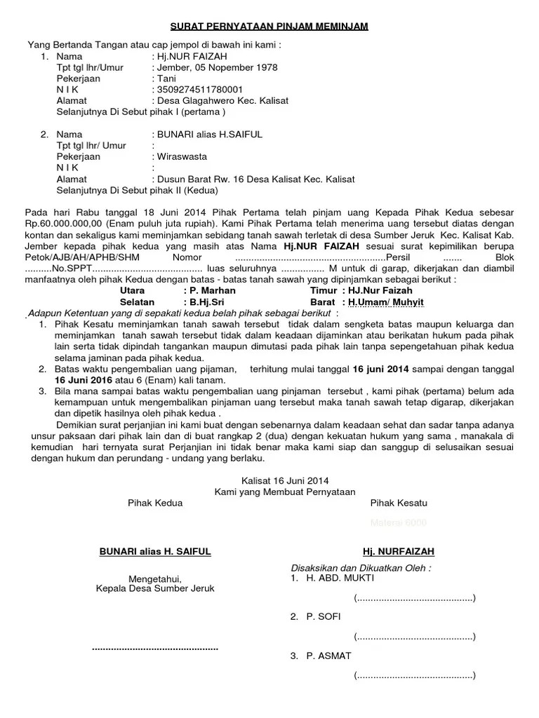 Contoh surat contoh surat permohonan pengajuan pinjaman ke perusahaan. Agar nantinya tidak terjadi suatu kekeliruan atau perselisihan yang merugikan. 5.600.000 (lima juta enam ratus ribu rupiah) kepada pihak kedua selambat lambatnya 2 (dua) bulan sejak surat perjanjian ini ditanda tangani, atau jatuh tempo pada tanggal 01 desember 2019 mendatang. Atas pinjaman uang tersebut, maka pihak pertama menyatakan bersedia untuk mengembalikan pinjaman sebesar rp. surat perjanjian ini dibentuk antara pihak peminjam dan pemberi uang.